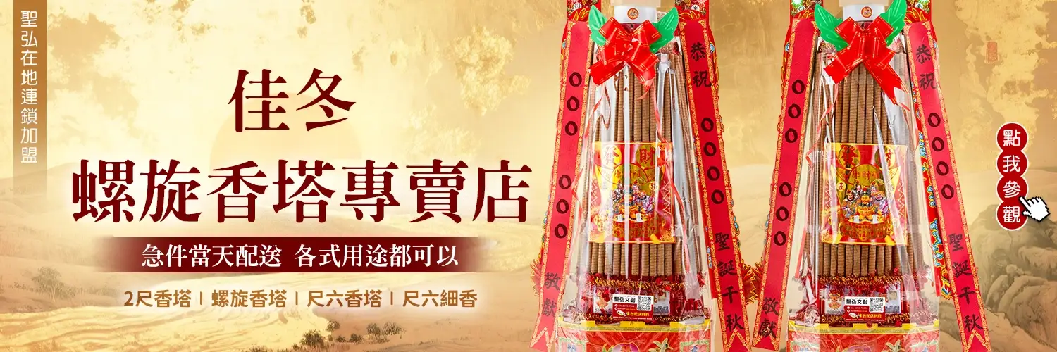 專門販售祝壽香塔、螺旋香塔、2尺香塔、尺六香塔、尺六細香、壽桃塔、拜拜豬羊、祝壽龍柱、祝壽烏龜