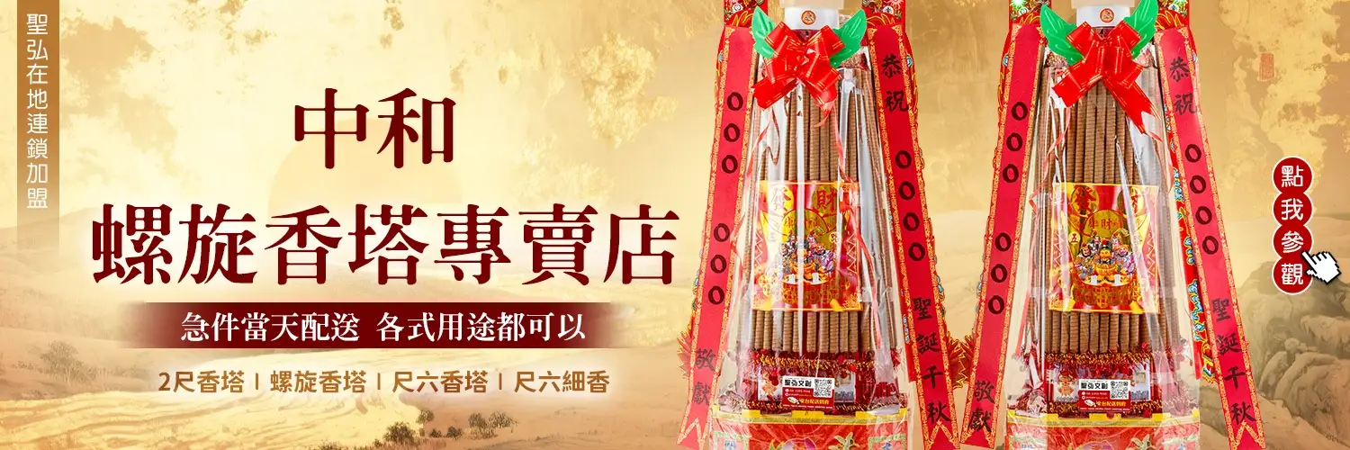 專門販售祝壽香塔、螺旋香塔、2尺香塔、尺六香塔、尺六細香、壽桃塔、拜拜豬羊、祝壽龍柱、祝壽烏龜