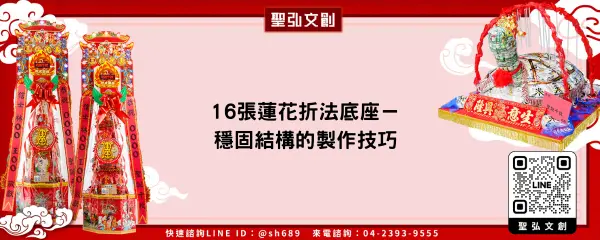 16張蓮花折法底座是在摺製16張蓮花時,用來支撐蓮花整體結構的重要部分。底座不僅保持蓮花穩固,也確保花瓣層次完整、排列端正。16張蓮花象徵圓滿、吉祥與功德累積,而底座的穩固則使蓮花供奉更具莊重與虔誠意涵。
