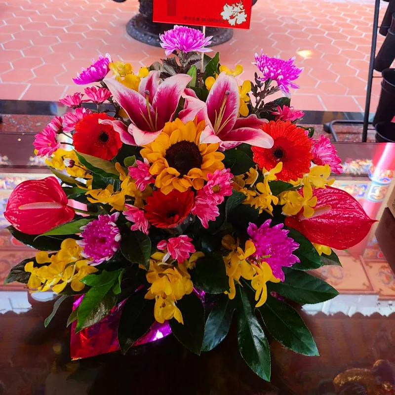 此款為:「藝術神明盆花-F」款式 【可客製化預算】 盆花用途: 祝壽、還願、敬神、答謝 皆可設計 – 盆花含意: 祝賀鮮花象徵美好、平安繁榮之意 送花給親友,將祝福心意傳遞出去