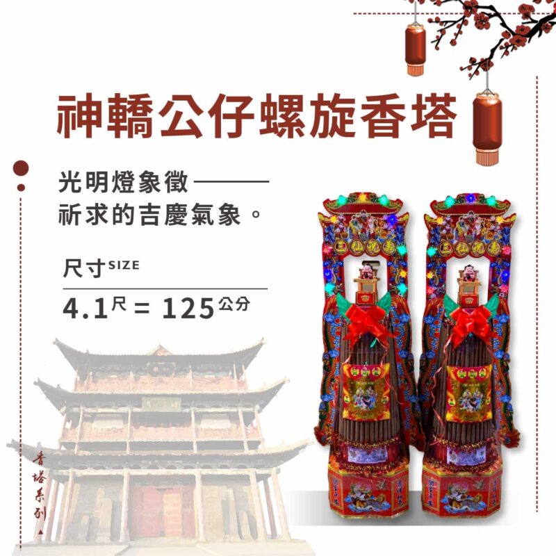 商品名稱:神轎公仔螺旋香塔 商品數量:一對 商品規格:約4.1尺 香塔可以選擇: 1.可燃燒「12小時」不燙手螺旋香「廟裡貢香」 2.尺六細香「家用拜拜的細香」 產品特色: 神轎公仔可愛又喜氣,象徵吉祥如意 祝壽後可送人或自用、都能得到加持