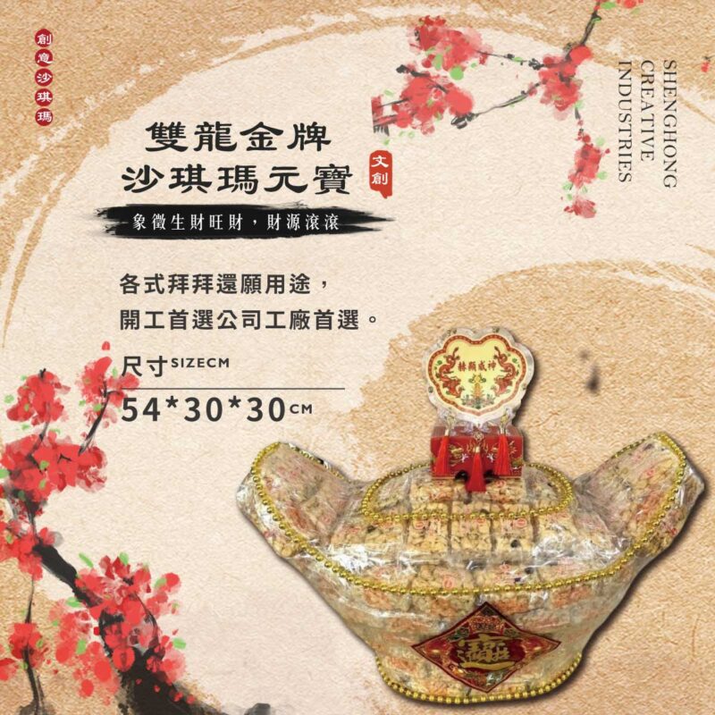 商品特色:用沙琪瑪製作成元寶樣式,元寶象徵招財進寶,雙龍金牌答謝神明最高敬意