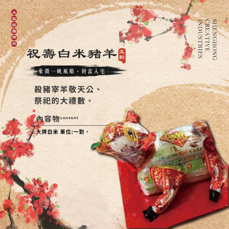 商品名稱:祝壽白米豬羊 商品數量:一對 商品規格:全斤數皆可客製化 商品內容物:白米 商品特色:酬神謝禮必備