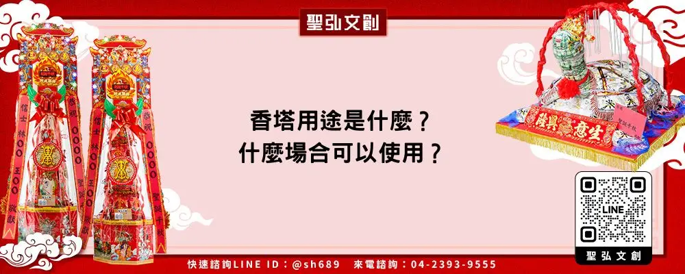 了解完香塔用途後,現在來推薦您優質的祝壽香塔公司「聖弘文創」。他們擁有全台最多款式的祝壽商品,無論是祝壽香塔、壽桃塔、祝壽龍柱、祝壽豬羊等,種類齊全,能夠滿足各種祝壽需求。「聖弘文創」的產品不僅品質優良,而且全台免運配送。他們擁有自己的工廠和倉儲,確保商品直接出貨,讓客戶享受最划算的價格。訂購流程也非常方便,只需加入他們的官方LINE:@sh689,即可與24小時線上客服聯繫,快速下單。無論是需要單獨訂購還是批發,他們都能提供專業服務和第一手價格。