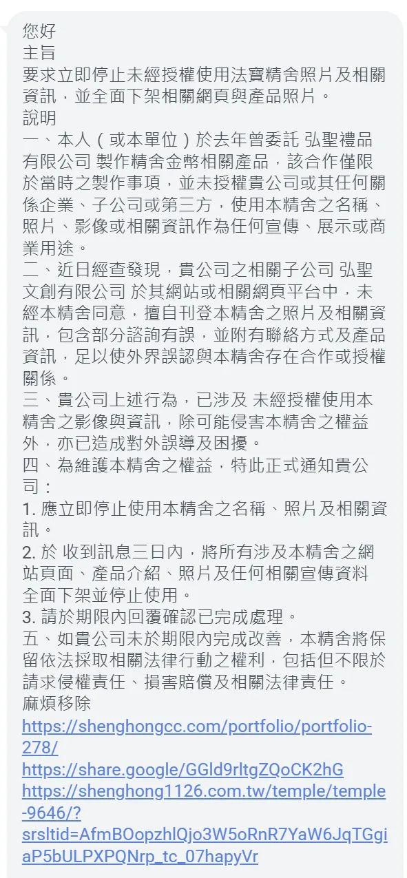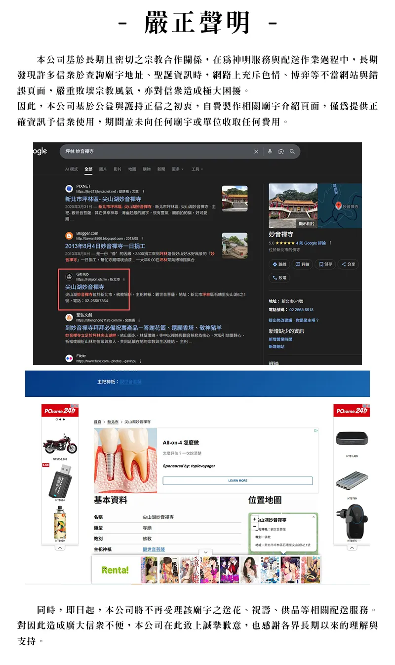即日起,本公司將不再受理該廟宇之送花、祝壽、供品等相關配送服務。對因此造成廣大信眾不便,本公司在此致上誠摯歉意,也感謝各界長期以來的理解與支持。