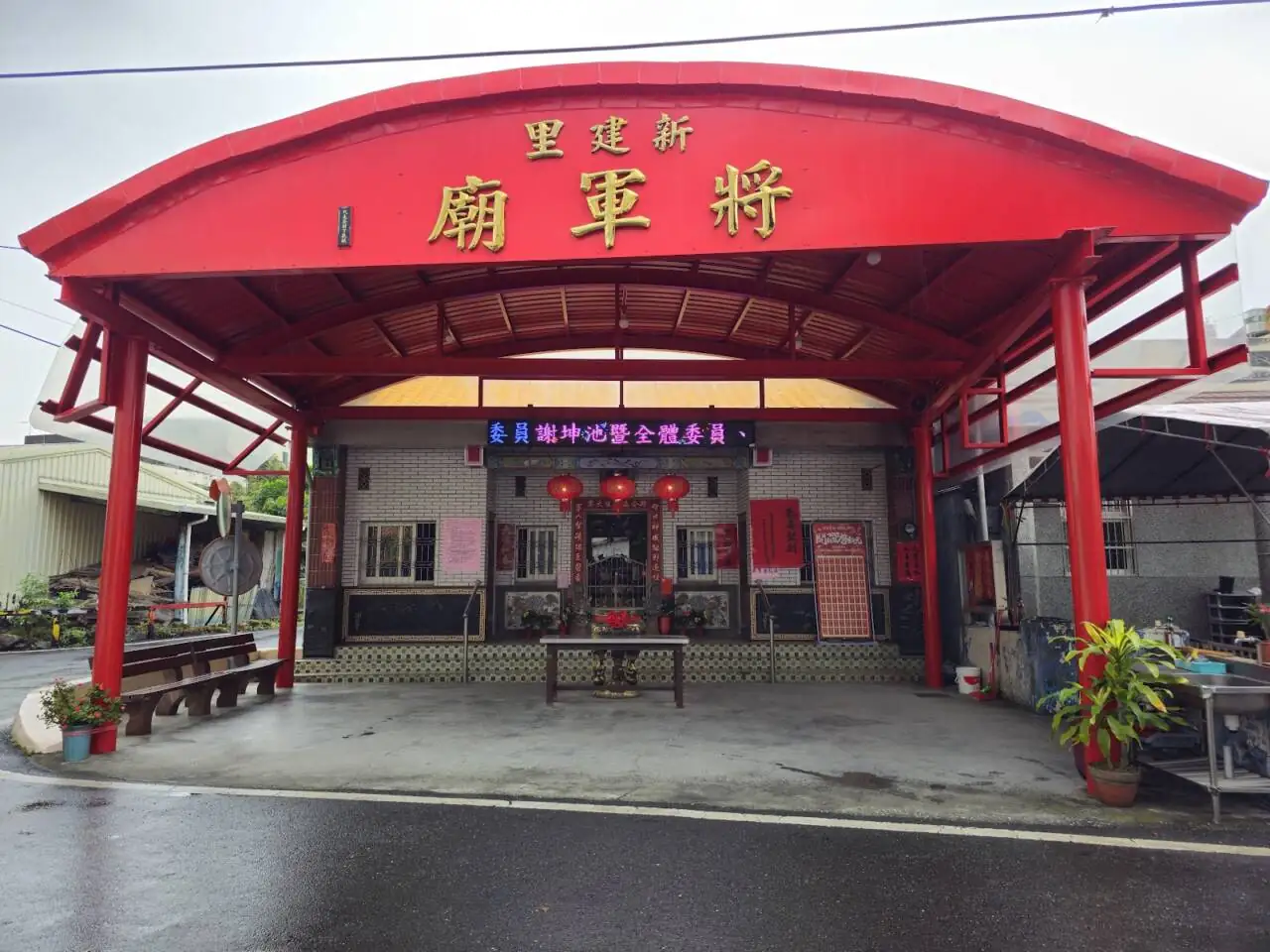 將軍廟座落於新興路,地址為宜蘭縣頭城鎮新建里新興路326號,鄰近善慧寺且距離不遠,從路旁的一條小徑可以通往新建社區活動中心。廟前有石階與木椅,庭院整潔,兩側有竹林與加蓋的棚架,形成夏日遮蔭的休憩空間。早晨常可見三五長者坐在廟庭「開講」,彼此交換新聞與生活大小事;周遭住宅多半與廟有親密互動,家門口常掛著祈福紅布幔,顯示廟與社區生活密不可分。廟地緊鄰社區動線,既方便居民參拜,也成為里民聚會的自然場所。