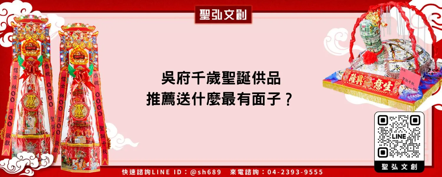 吳府千歲聖誕供品種類多樣化,除了上面推薦這兩款,也可以根據自己的預算、心意去做準備,「聖弘文創」專門製作祝壽商品,提供各式各樣的款式給大家挑選,有需要訂購的朋友,加入官方LINE:@sh689,詢問訂購。